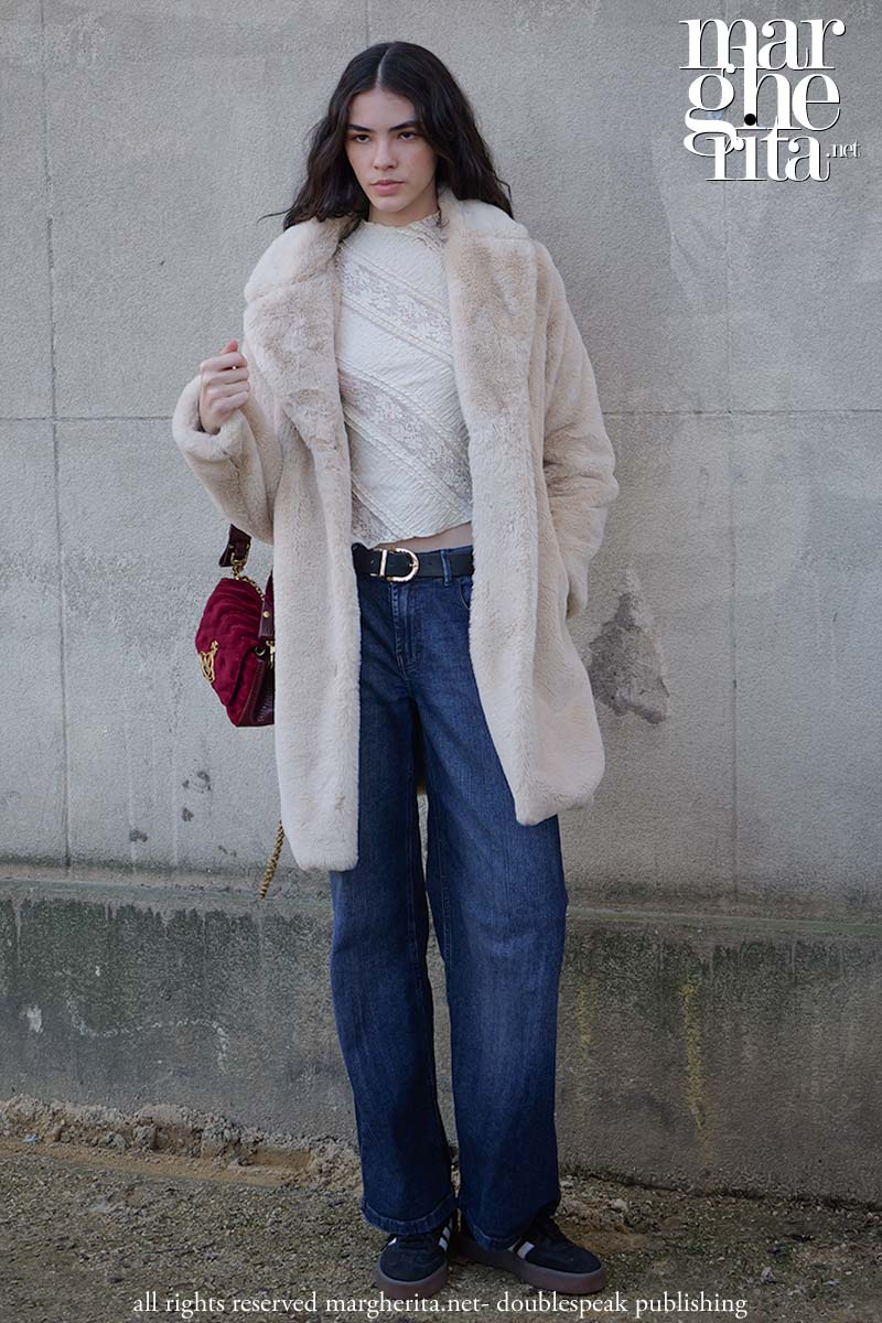 Un gioco di contrasti perfettamente riuscito. Il cappotto in eco-pelliccia color avorio richiama l’eleganza senza tempo di Hollywood, mentre jeans e sneakers mantengono il look ancorato alla realtà urbana. La sorpresa? Il top in pizzo, che aggiunge un tocco romantico e femminile. La borsa in velluto rosso borgogna è la chicca finale. Texture, colori e stili convivono in armonia, in un equilibrio sofisticato e moderno.